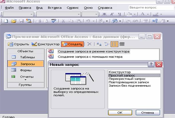 диалога Новый запрос (см. рис. слева) выбрать режим Простой запрос. Использовать
