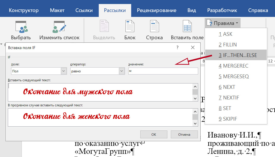 - В выделенных фиолетовым цветом позициях предусмотреть изменение окончаний согласно полу адресата посредством добавления Правила IF