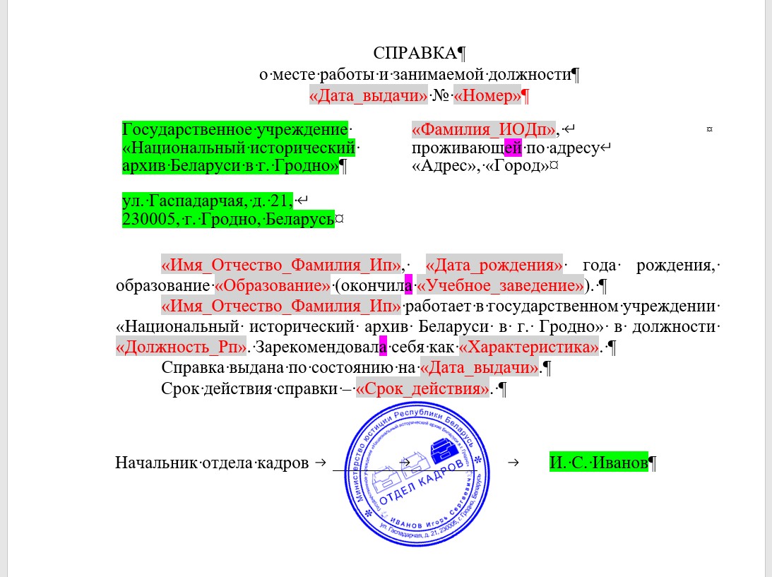 - Фрагменты, выделенные серым и фиолетовым цетом, будут заполнены в последующем необходимыми полями и правилами слияния.