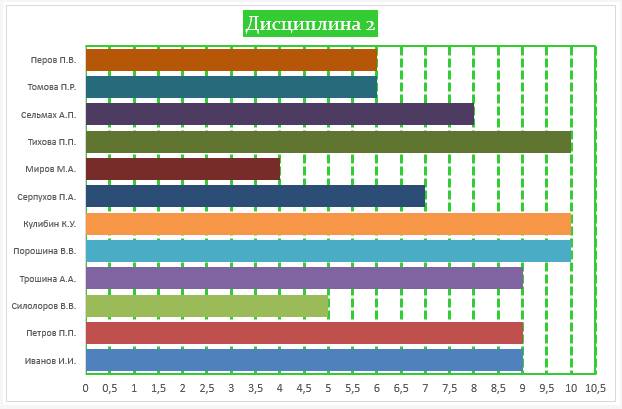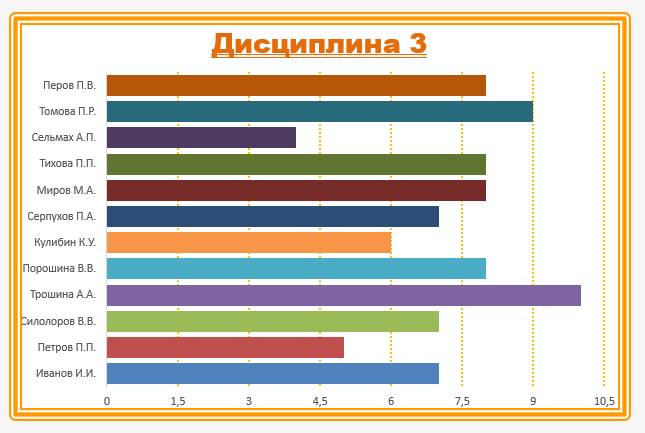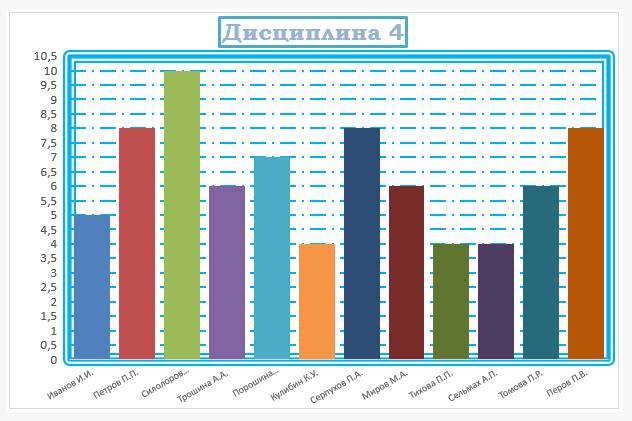 vii) в столбце "Кто получил десятки?" ("Кто получил четверки?") посредством функции ЕСЛИ() следует проставить свои инициалы латиницей (например, Иванов Петр Сергеевич - IPS) для тех студентов, которые получили хотя бы одну десятку (хотя бы одну четверку соответственно). Выделение цветом задается посредством условного форматирования с испозованием цветов из палитры согласно варианту;