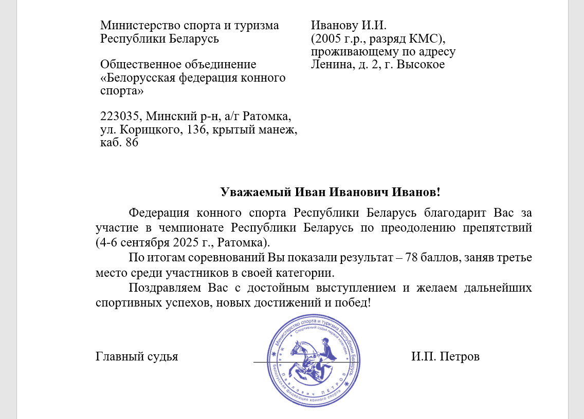 Используя слияние, подготовить письма по результатм соревнований для всех студентов Вашей подгруппы, но не менее 15.